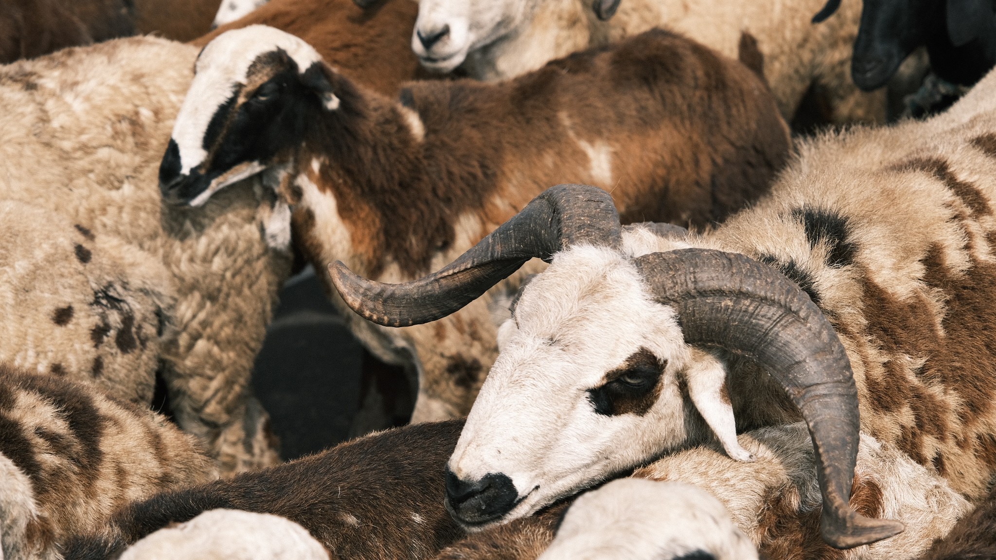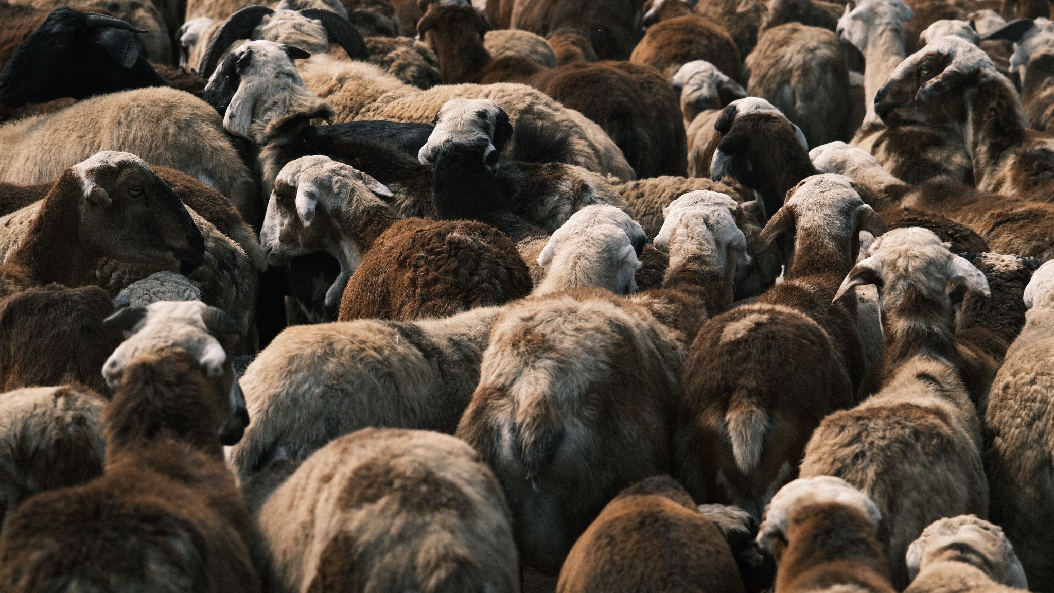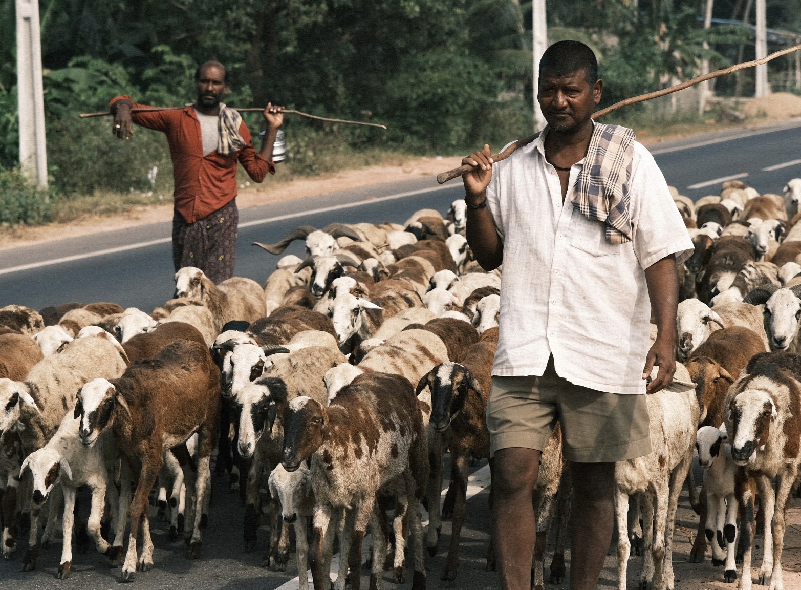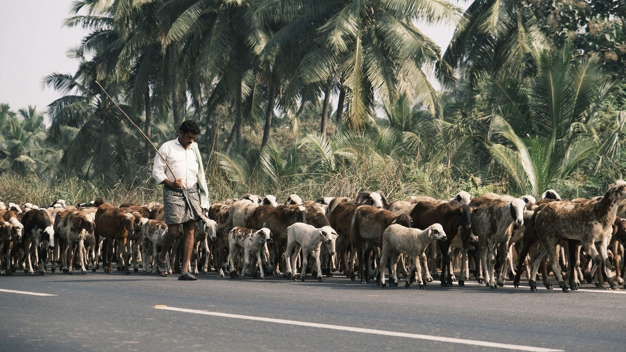 Shepherds walk their herd of goats across the highway near Amalapuram, Andhra Pradesh.